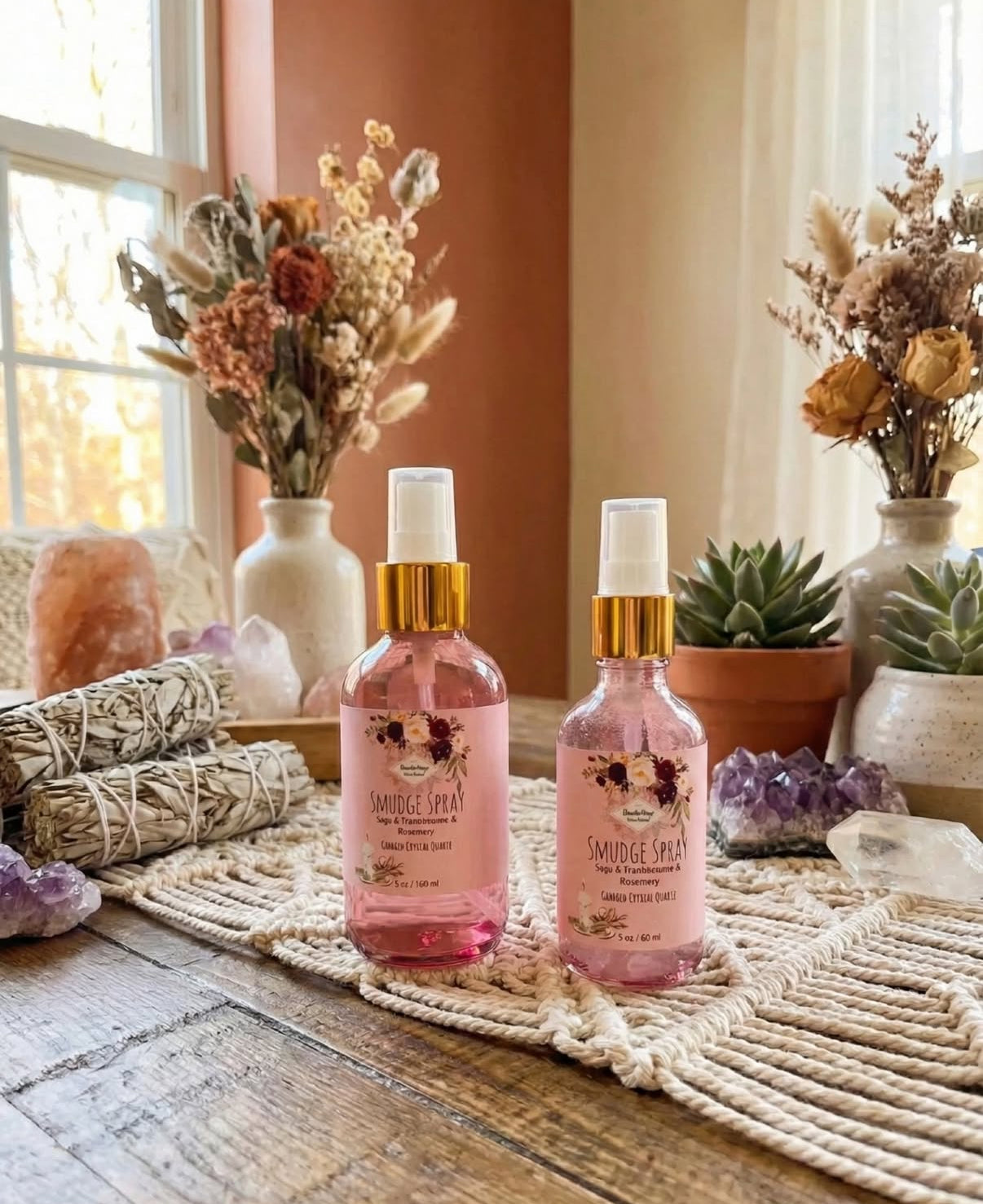 Ingredients: Distilled water, crystal quartz, 100% theraputic grade essential oils (Sage, Frankinscense, Rosemary)